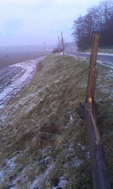 Další z nefunkčních sloupů směrem ke Kolonce padl dneska díky rannímu náledí. Auto jedoucí od Kolonie sice přišlo k úhoně (kus plastového nárazníku bylo ještě odpoledne na místě), betonový fundament byl po nárazu vychýlený, dřevěný sloup přeražený a poškozený automobil, který sjel ze stráně do pole, byl odtažen traktorem.