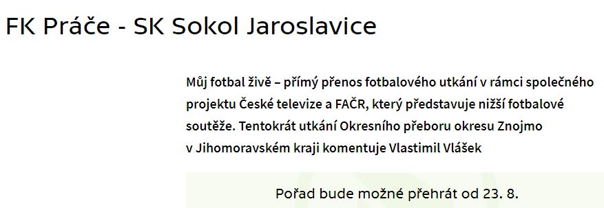 Můj fotbal: Práče - Jaroslavice, NE 23.8.2020, 10:15 h, hřiště Práče, HR určen OFS Znojmo, zápas vysílá v přímém přenosu ČT Sport.